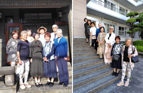 当日は目黒駅に8名が集合し、昔ながらドレメ通りの入口にある「香港園」で賑やかにお喋りを楽しみながら会食。その後、杉野記念館で杉野芳子先生をはじめ杉野家のご仏壇にお線香をあげことができました。大学校舎の入口の階段での記念写真も出来、新しい第二校舎も見学し、一同大感激し、大満足‼ 忘れられない素晴らしい一日になりました。